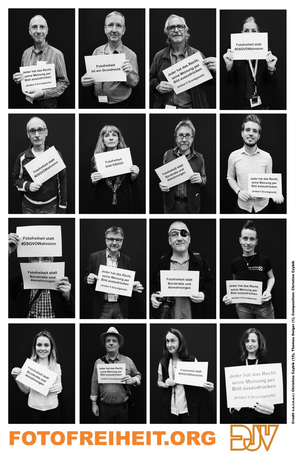 Klare Ansage für die Fotofreiheit: Besucher der photokina 2018 posieren für fotofreiheit.org
